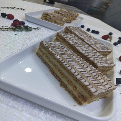 طبقات من البف باستري ذهبية ومقرمشة ، محشوة بكريمة فانيلا ناعمة ، ومزينة بالشوكلاته الفاخرة