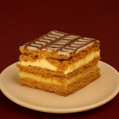 طبقات بف باستري ذهبية ومقرمشة ، محشوة بكريمة ومزينة بلمسات من الشكولاته الفاخرة