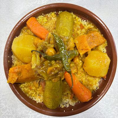 حبيبات كسكس مطهوة على البخار، تُقدَّم مع خضروات موسمية مختارة مع دجاج مطهو بإتقان، يجسّد أصالة المذاق المغربي في طبق فاخر.